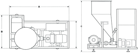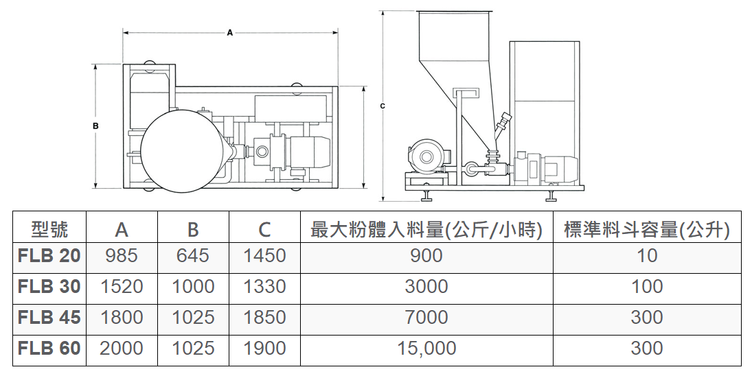 | 型號 | A | B | C | 最大粉體入料量(公斤/小時) | 標準料斗容量(公升) |