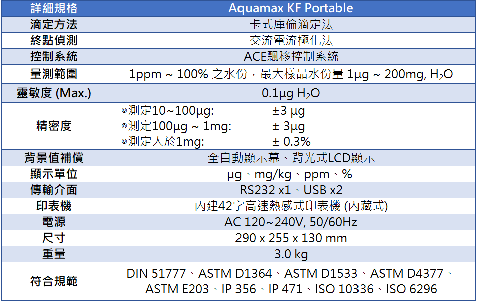 • 符合 DIN 51777、ASTM D1364、ASTM D1533、ASTM D4377、ASTM E203、IP 356、IP 471、ISO 10336、ISO 6296 標準規範